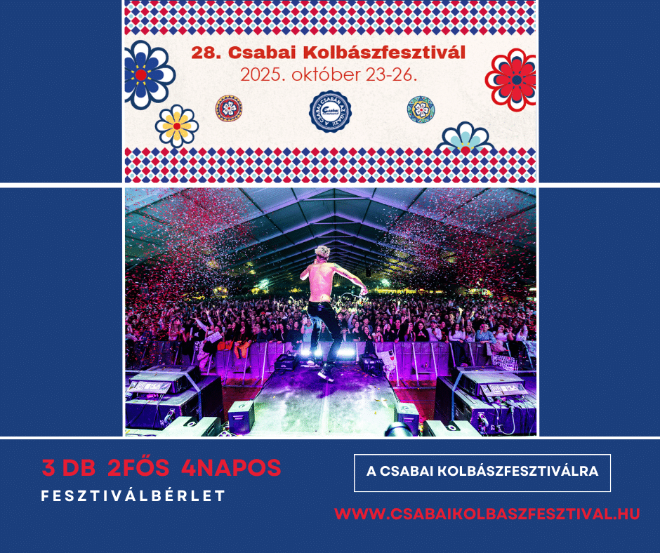 3. díj: 3 db 2 főre szóló 4 napos fesztiválbérlet a Csabai Kolbászfesztivál -ra
